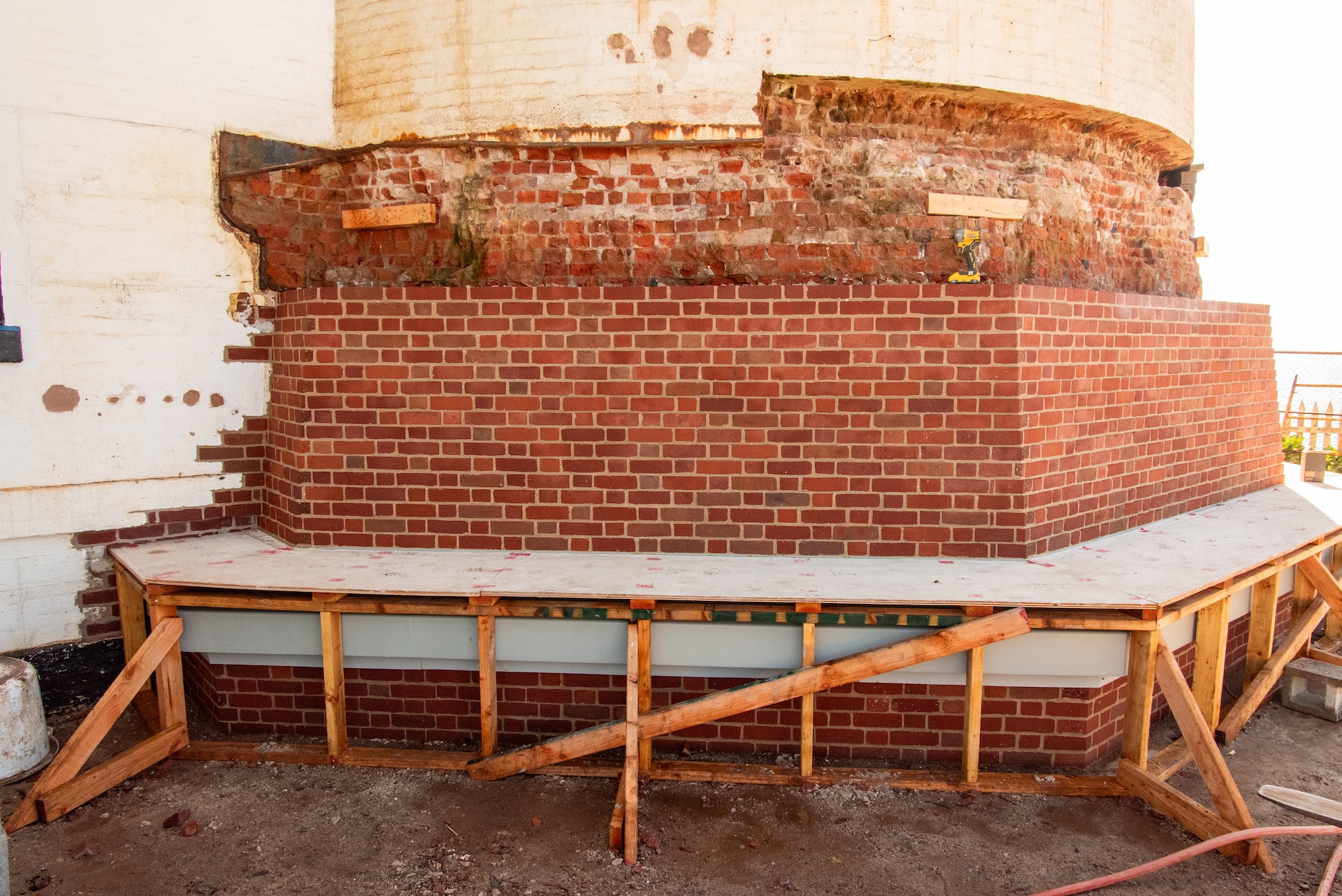 A related surprise was that the original layer of paint on the oil house chimneys turned out to be white rather than a red, brown or black color. Once the brickwork was fully prepped, a new white coating was applied, matching both the original color and other similar lighthouses.