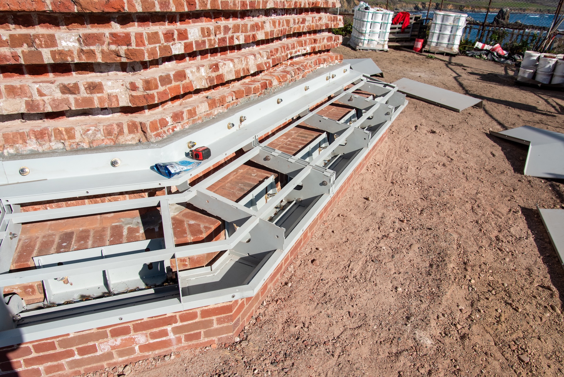 Marine-grade stainless steel replacement parts are installed to recreate the belt courses of the lighthouse