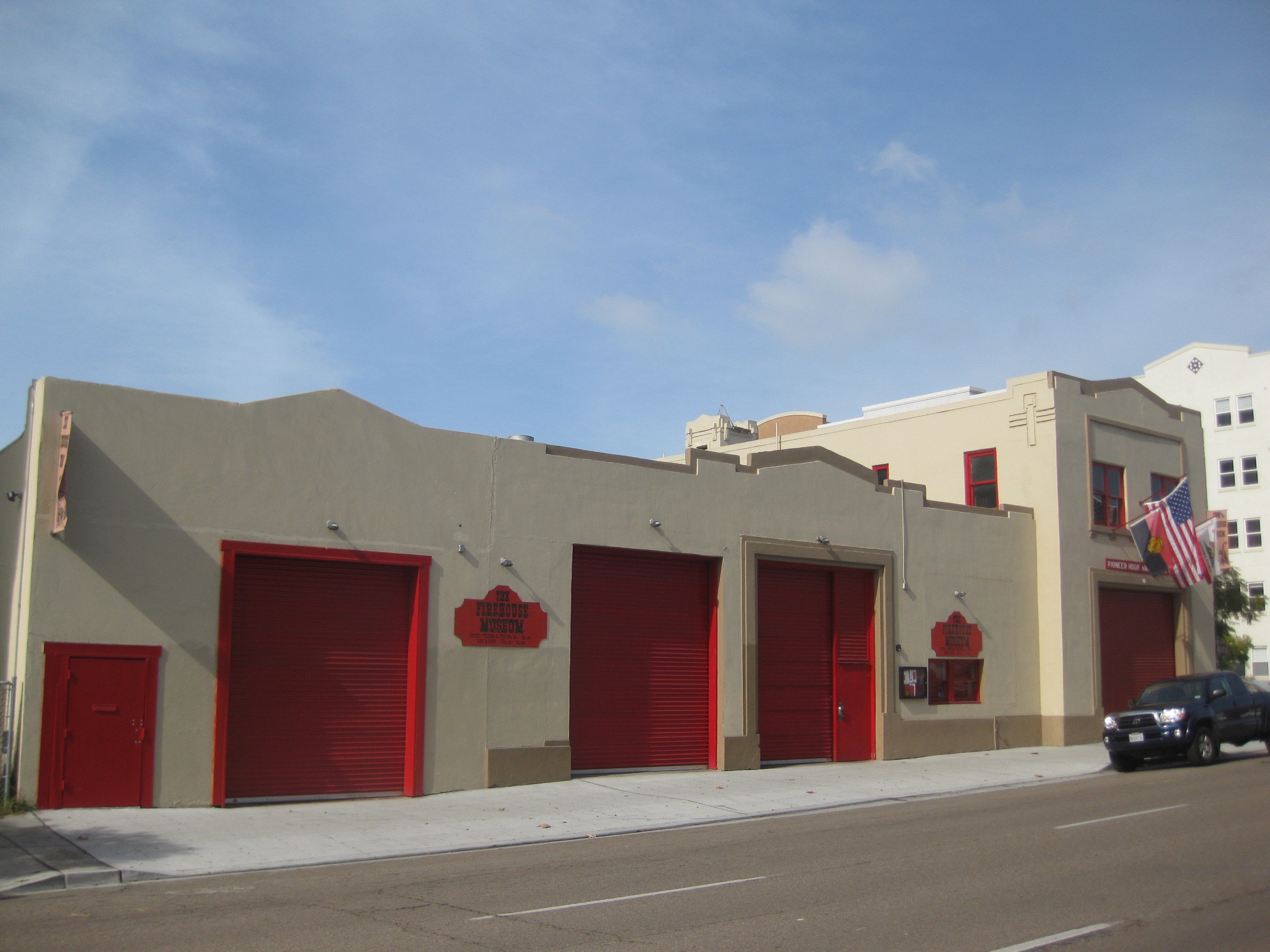 San Diego Fire Station #6 is a fire station and maintenance facility located in the Little Italy neighborhood of San Diego. The building combines a two-story firehouse with a one-story machine shop in garage, with minimal elements of Mission Revival style architecture. The property is significant for its association with fire chief Louis Almgren, who built the first internal combustion powered fireboat at this location, and inventor Robert Ely, who developed the Ely Fire Hose Thread Standardizer, now known as the National Standard Thread used by all fire departments across the United States.