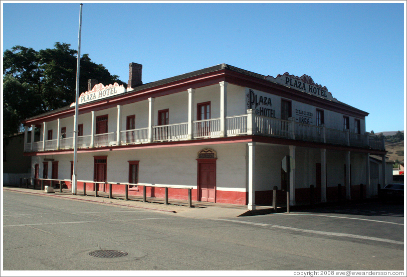 Plaza Hotel (Update) Following use as a dormitory, barracks, then private residence, the original 1792 one-story adobe was expanded with a timber second story and turned into a hotel in the late 1850s. It became the headquarters for the overland stage, and a favorite stopping place for fiesta guests, traders, and travelers.